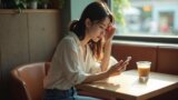夜のカフェでスマホを見つめ、ペアーズなどのマッチングアプリに疲れ、将来への焦りを感じている35歳独身の日本人女性のイメージ画像 大人の婚活ノウハウ